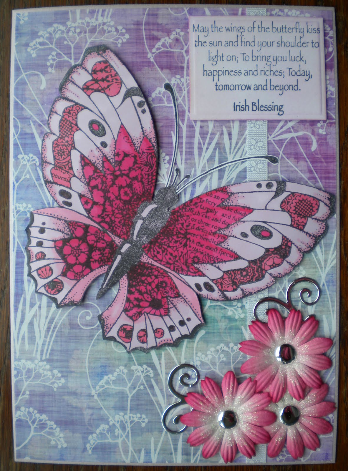 I can't believe that it's Friday again, it has come around so quickly. This is my contribution to Forgotten Friday over at Poppy Cottage this week. Last week I used the Harlequin Butterfly stamp plate, and while I was getting them out of the cupboard I also got out the Patchwork Butterfly stamp plate. Last night I stamped out the butterfly and the sentiment several times, and I coloured 3 in while watching the TV intending to pick the one that I liked the best to post on here today. This morning I printed off 3 different backing papers from the Artylicious Essence of Nature CD and put 3 cards together, all very similar. However I could not decide which one I like the best so I have posted all 3.
